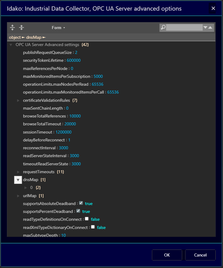 Also, if the server returns endpoint URL with different port number than actual port number the server is listening on, such as in case of port number mapping in Docker containers, it becomes more complicated. To resolve such cases, Edit Advanced Options dialog window has the urlMap field. Here you can enter arrays of pairs which are used to map endpoint URL returned by the server to desired substitute. For example, to connect to the demo OPC PLC server running in Docker container with service name (as well host name) opcplc, with endpoint URL opc.tcp://opcplc:50000/ (note the trailing backslash - it is required too), which is mapped to the Docker host’s port 50001, you can map it to opc.tcp://localhost:50001/.