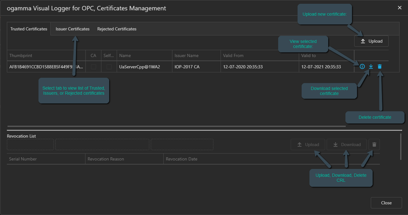 The list of trusted and issuer certificates as well as rejected server certificates can be viewed in Certificates Management dialog window (opened via the Settings menu). Here you can also upload certificates, downlod them, view their content, and delete them. It is also possible to upload certificate revocation lists, as well as download or delete them.