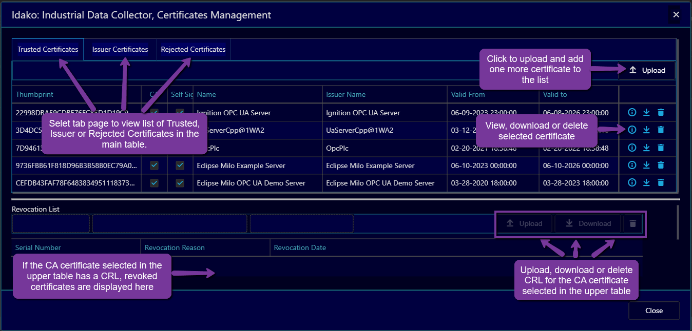 The list of trusted and issuer certificates as well as rejected server certificates can be viewed in the Certificates Management dialog window (opened via the Settings / Certificate Management menu). Here you can also upload certificates, downlod them, view their content, and delete them. It is also possible to upload certificate revocation lists, as well as download or delete them.