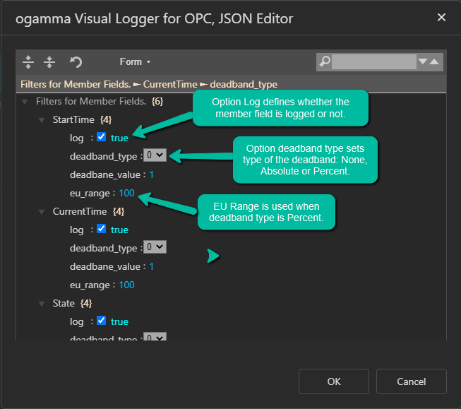 Expanded- data fields are expanded up to primitive type values, and each member field value is logged individually. In this case also it is possible to configure for each leaf member field the deadband settings, and turn on and off logging for that field. Logging inExpandedmode allows to save on database storage and network bandwidth in cases when most members of the complex type value are static and only few members change often. For example, standard variableObjects/Server/ServerStatushas only one member field changing:CurrentTime, other fields are static.Note