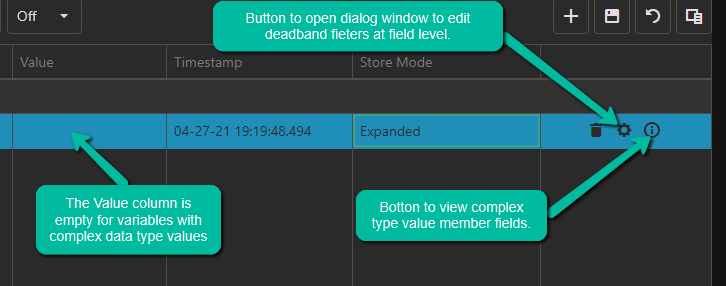 Refresh Databutton. If complex type value is read successfully and could be decoded, default settings will be created with logging of all nodes set to Off and deadband type set to None. After editing filter fields and closing JSON editor dialog window, click on theSaveicon localted on the top right area of theLogged Variablestable to save changes. To disable applying these filters, switch the JSON editor mode toTextmode and enter filter value{}. To populate the filter settings with default values switch the JSON editor into Text mode, clear the content completely, and save changes. After refreshing of real time data the filter settings will be set to default values.![]()