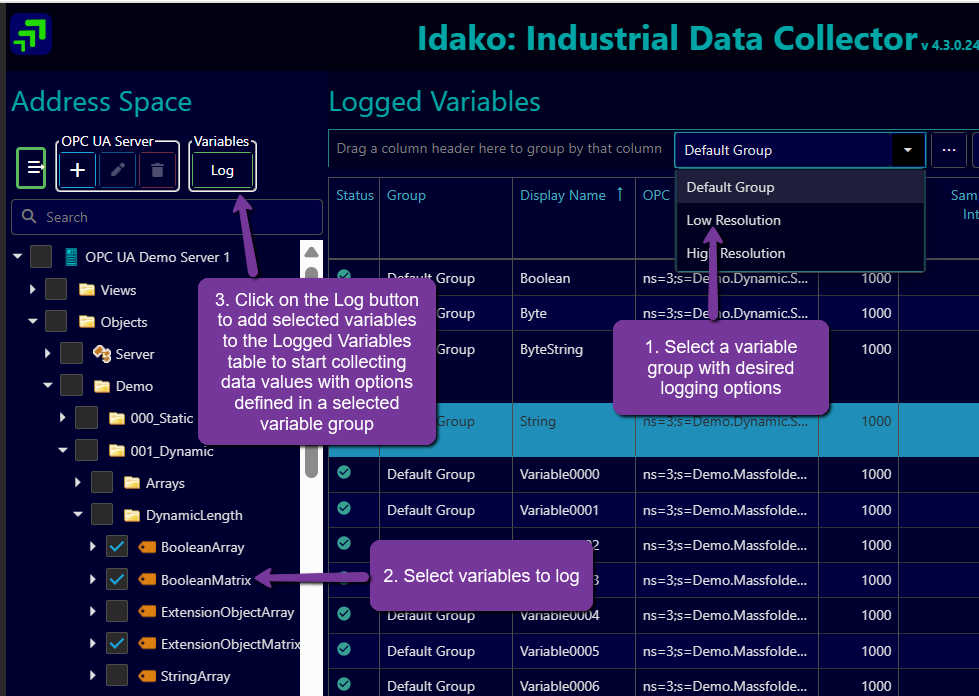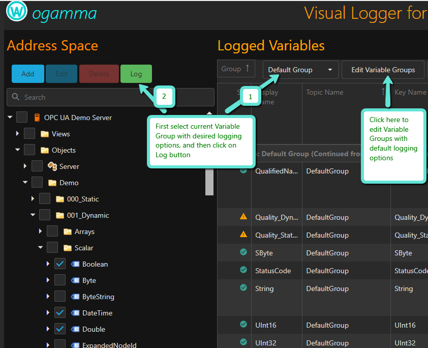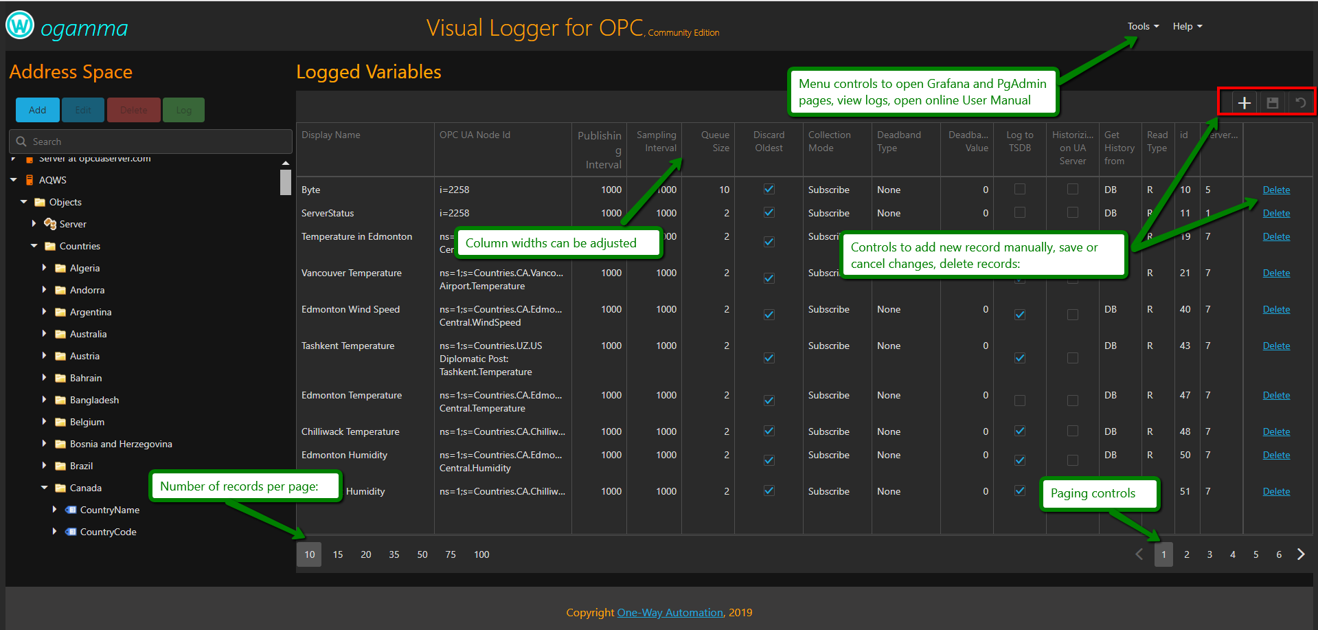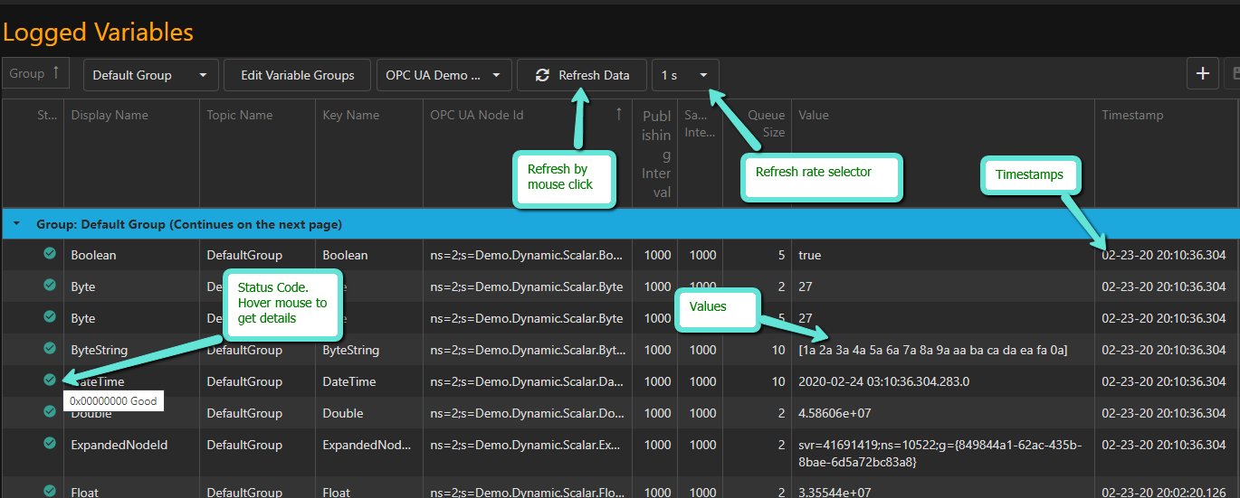 Logged Variables table defines list of OPC UA Variables for which values are collected and logged into time-series database. Some features of the table are highlighted below.