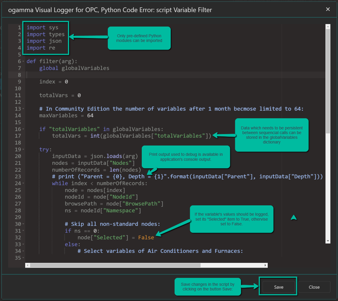 Variable Filter Scriptis called by passing the list of variable nodes (with attributes such asBrowse Path,Display Name,OPC UA Node ID) from this browse result, and with additional information about the parent node. In the script it is possible to set for each variable the flag indicating weither the variable should be logged or not. Also it is possible to set logging parameters, including OPC UA monitored item parameters as well as parameters used on records logged to the destination database such as MQTT or Kafka topics.Browse Filter Script- it is called with list of nodes in the browse result, and should return boolean array with the same length and the same order, as the list of nodes passed to it. If value of the element corresponding to the node isTrue, then that node will be browsed further down.