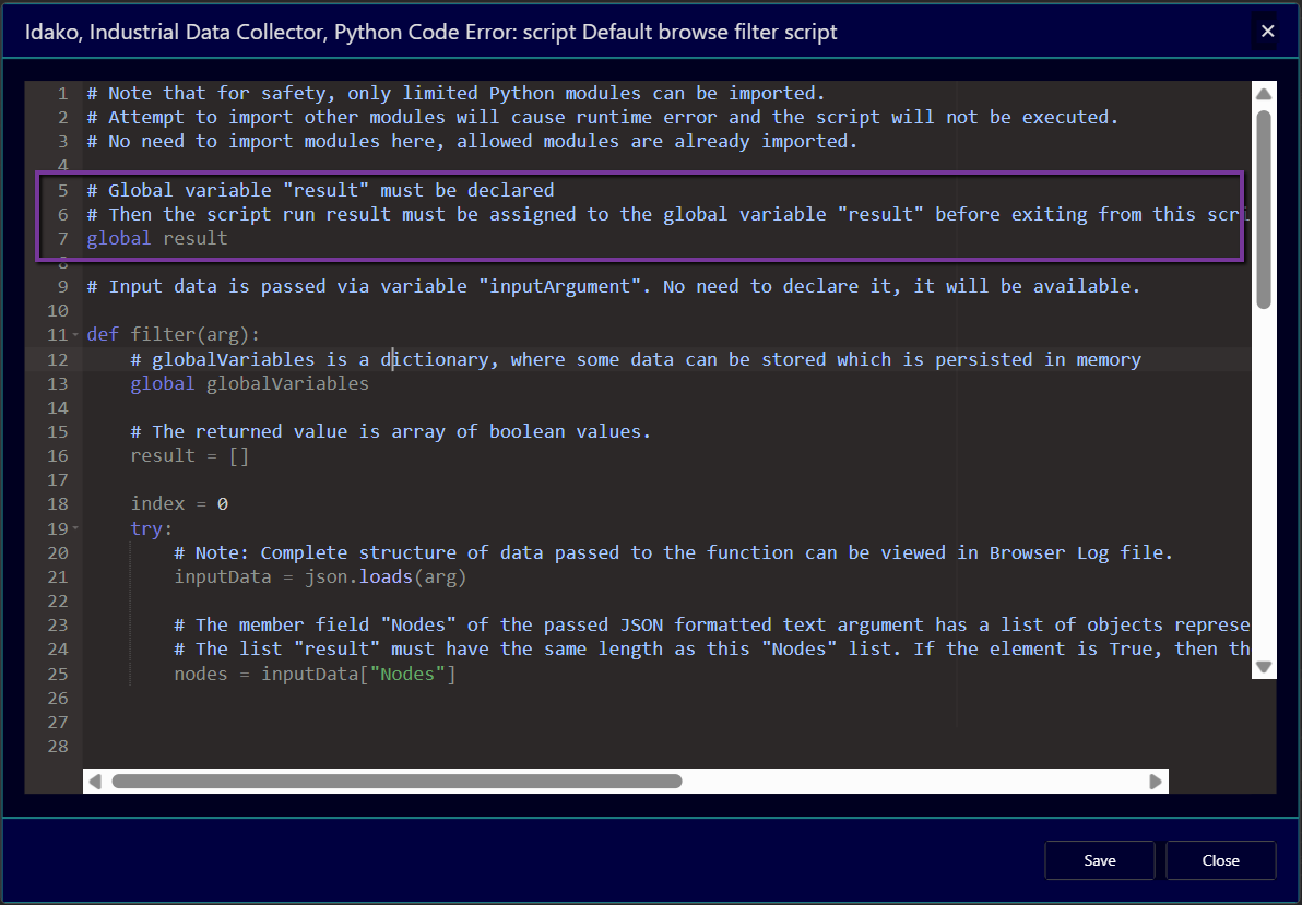 Python scripts are stored in the Scripts table, which can be accessed from the main menu Settings / Scripts, or from the dialog window Browse and select variables to log, by clicking on the icon to the right from the script selection drop-down field. Once the script debugging is complete, logging can be turned off for better performance. When scripts are saved via Industrial Data Collector configuration GUI, their copy is saved in the filesystem too. When the script content is edited via Industrial Data Collector configuration GUI, the newer version is displayed on the GUI: from the file system or from the configuration database. This way version of the script in a file is kept in sync with the database version. Having script files in the filesystem allows to manage change history and control different versions using solutions like Git.