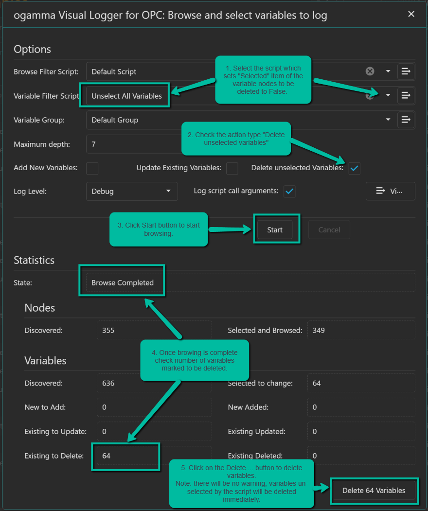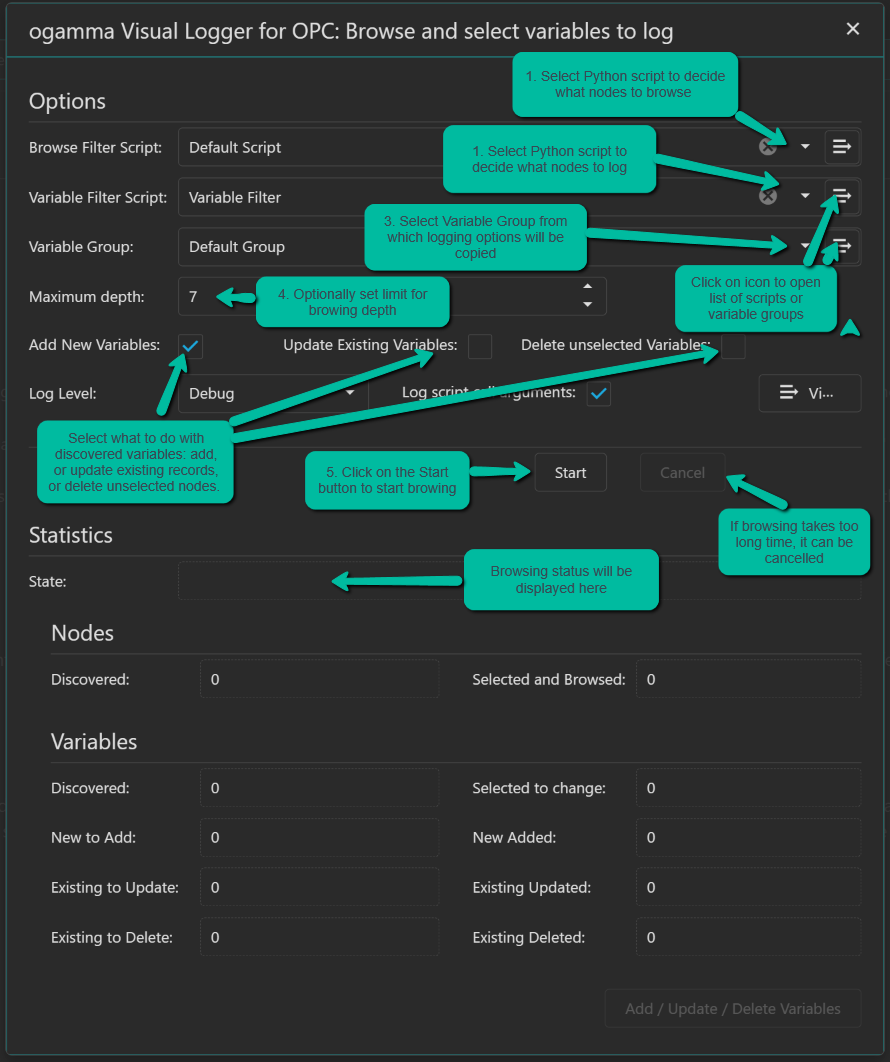 In dialog window Browse and select variables to log select scripts to filter browsing results to continue browsing, and to filter variables. Also, select the Variable Group - monitoring parameters such as Sampling Interval will be copied from it. You can limit how deep the browsing can continue. Then set values of checkboxes defining what to do with the selected nodes - to add variables which are not logged yet, or update or delete existing logged variables. Note that any variable with a given OPC UA Node Id can be logged only once.