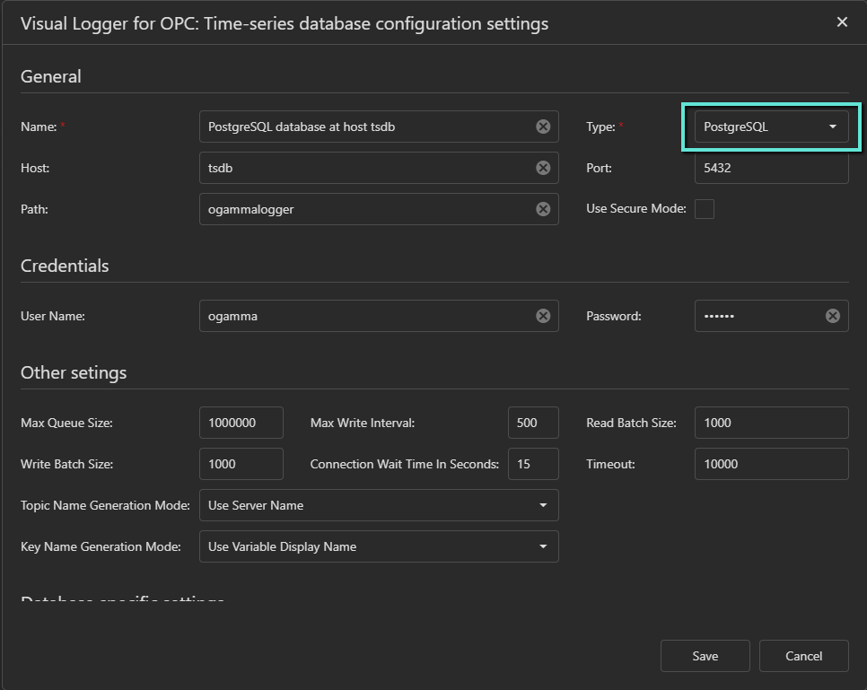 Storetime-series data, i.e. value/quality/timestamps for OPC UA variables. Multiple time-series database connection settings can be configured.Assign specific combination of settings for
