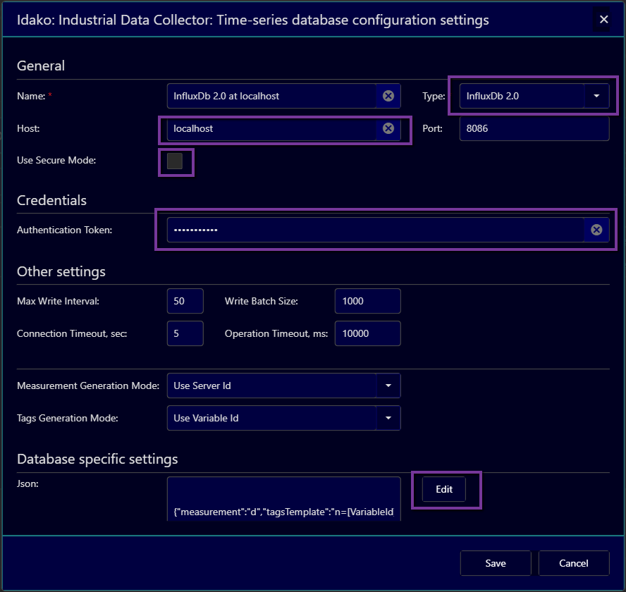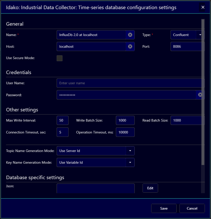 This section describes settings in the Time-Series database connection settings dialog window (opened via menu Settings / Time-Series Databases, by selecting of a row and clicking on the Edit icon).