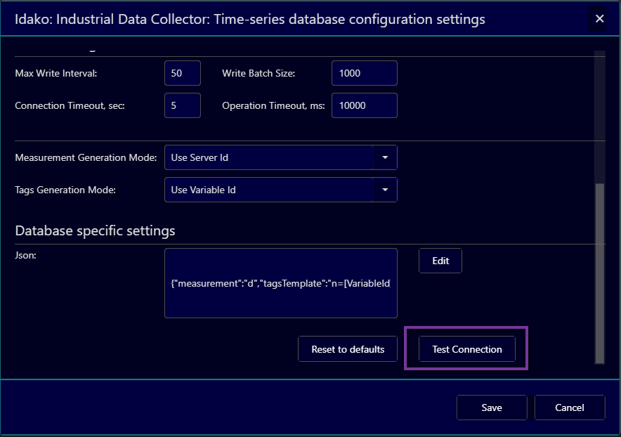 Then following below options should be configured in Timeseries database connection settings dialog window: