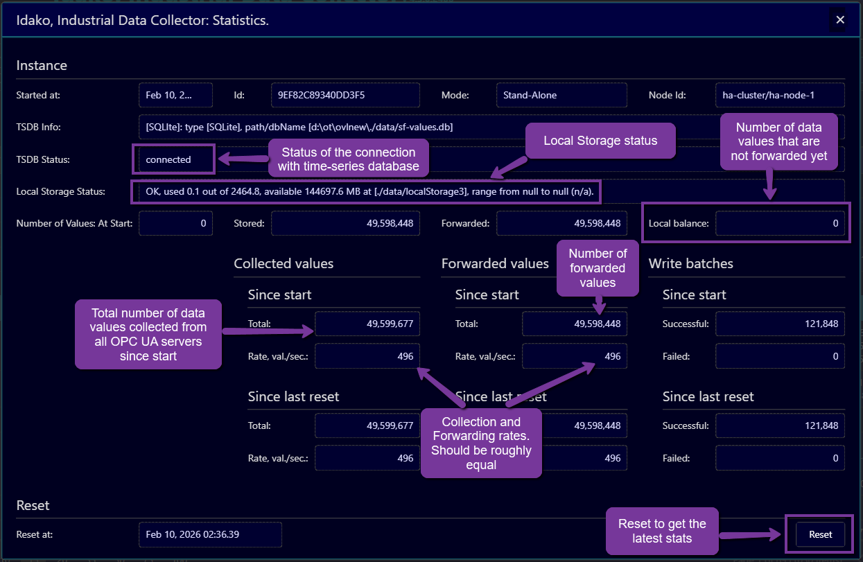 You can view information about status of the connection with the TSDB and statistics about Collected, Stored & Forwarded data values in the