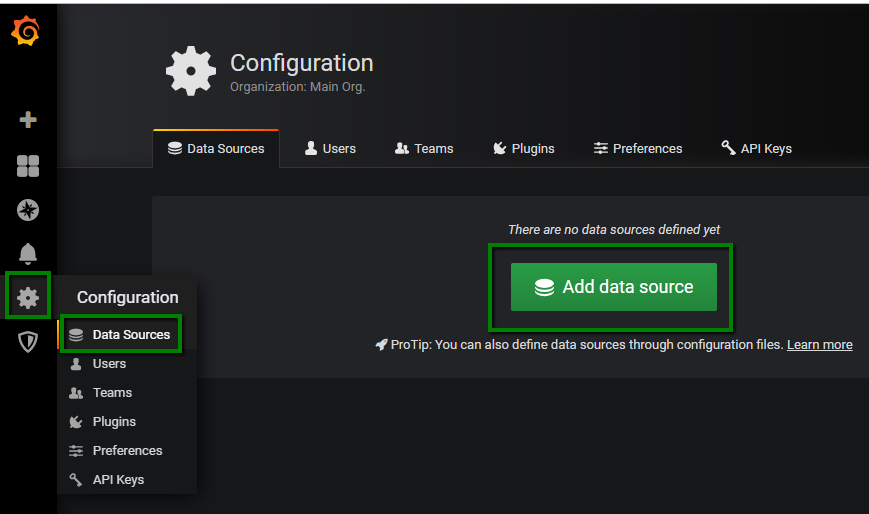 Data Sourcespage in Grafana, and click on buttonAdd Data Sources.Select