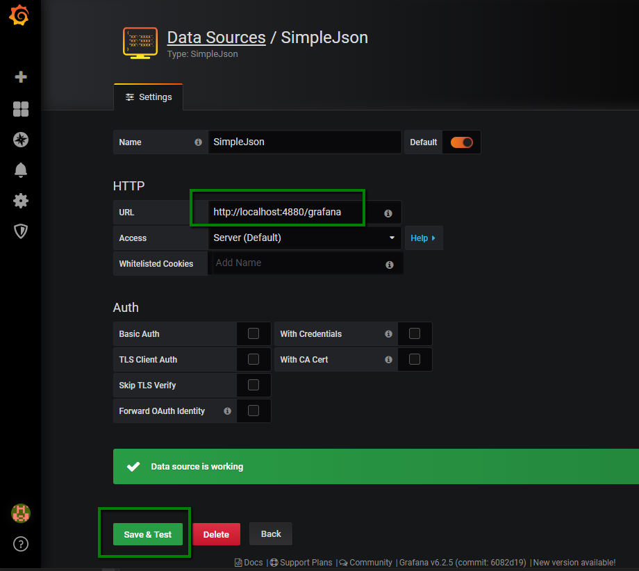 SimpleJsondata source plugin (instructions are available at https://github.com/grafana/simple-json-datasource).Add data source of