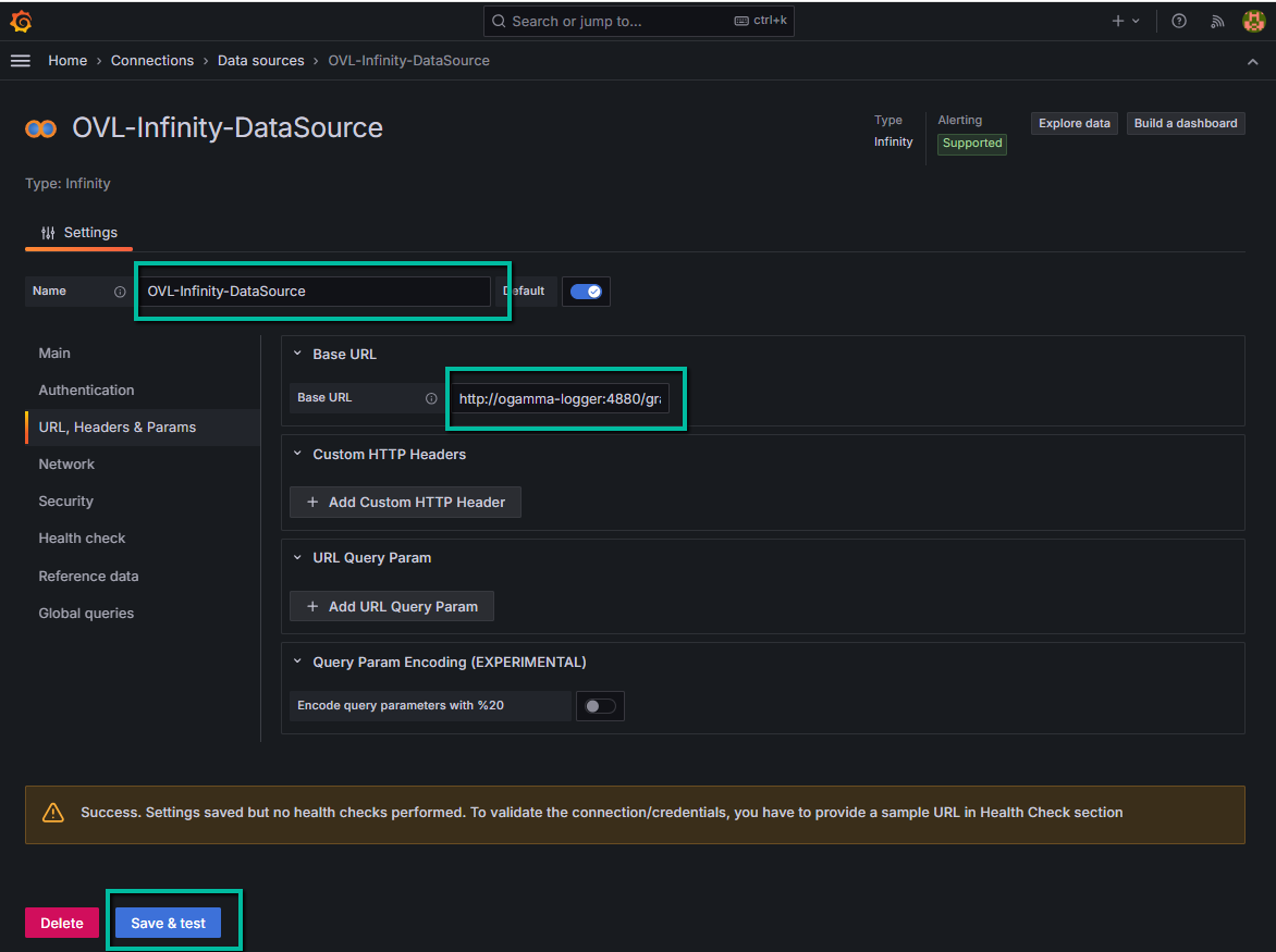 http://ogamma-logger:4880/grafanain case when both Industrial Data Collector and Grafana are running in Docker), and click on the buttonSave & Test. Ignore the warning that health checks were not performed.