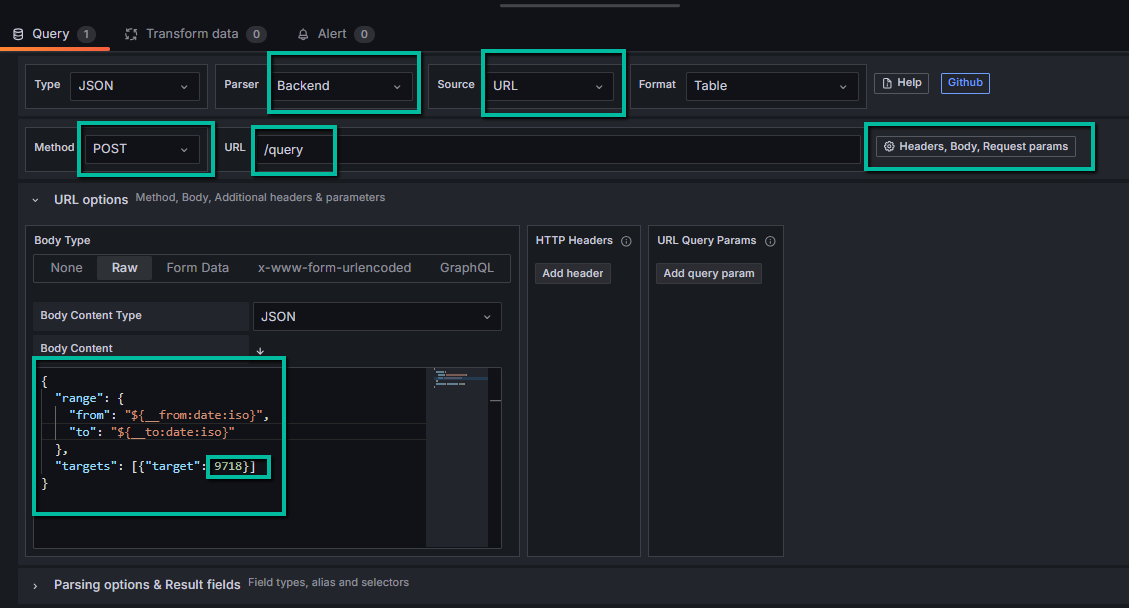 Body Contententer JSON formatted query payload. Change the value of the JSON membertarget(9718in the example below) to the variable Id accordingly to the value of theidcolumn of the variable line from theLogged Variablestable:{ "range": { "from": "${__from:date:iso}", "to": "${__to:date:iso}" }, "targets": [{"target": 9718}] }